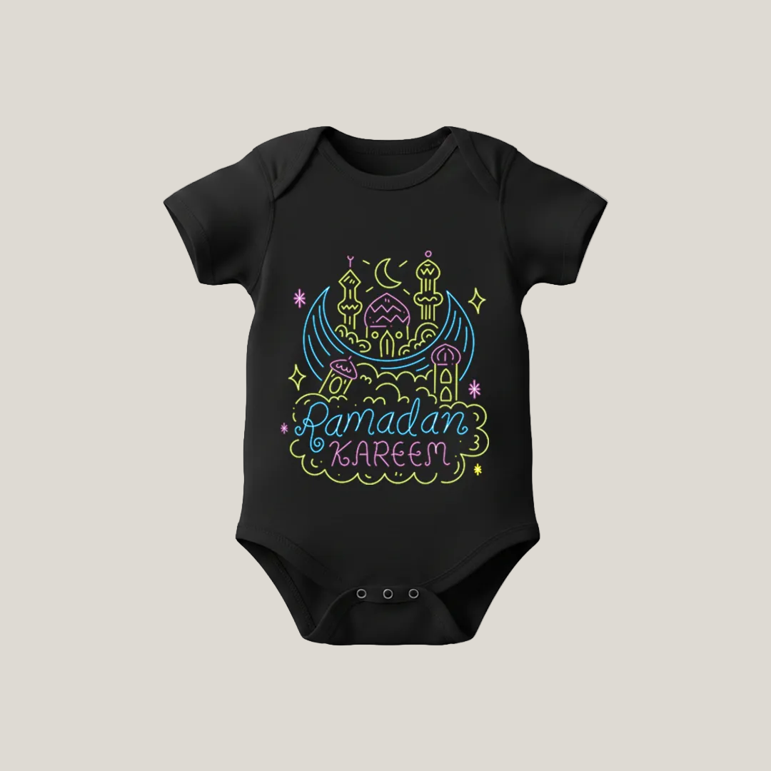 • Features a beautiful “Ramadan Kareem” design with elegant neon-style line art mosque illustration • Modern yet spiritual artwork that reflects the peaceful essence of the holy month of Ramadan • Made from soft, breathable cotton fabric that is gentle and safe for delicate baby skin • Lightweight and comfortable material ideal for all-day wear • High-quality, durable print designed to stay vibrant after multiple washes • Comfortable snap-button closure for easy diaper changes • Soft neckline and stretchable fit for easy dressing • Suitable for baby boys and girls • Perfect outfit for Ramadan gatherings, family iftars, Eid preparations, and photoshoots • Makes a thoughtful and meaningful Ramadan gift for newborns and infants • Ideal Islamic baby clothing choice for celebrating faith in a modern style • Combines comfort, spirituality, and adorable design in one outfit