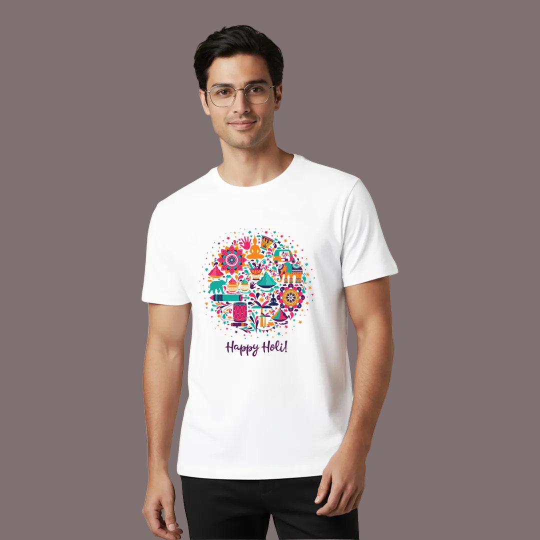 Happy Holi White T-Shirt for Men & Women – Vibrant Festival of Colors Graphic Tee | Comfortable Cotton Festival Wear